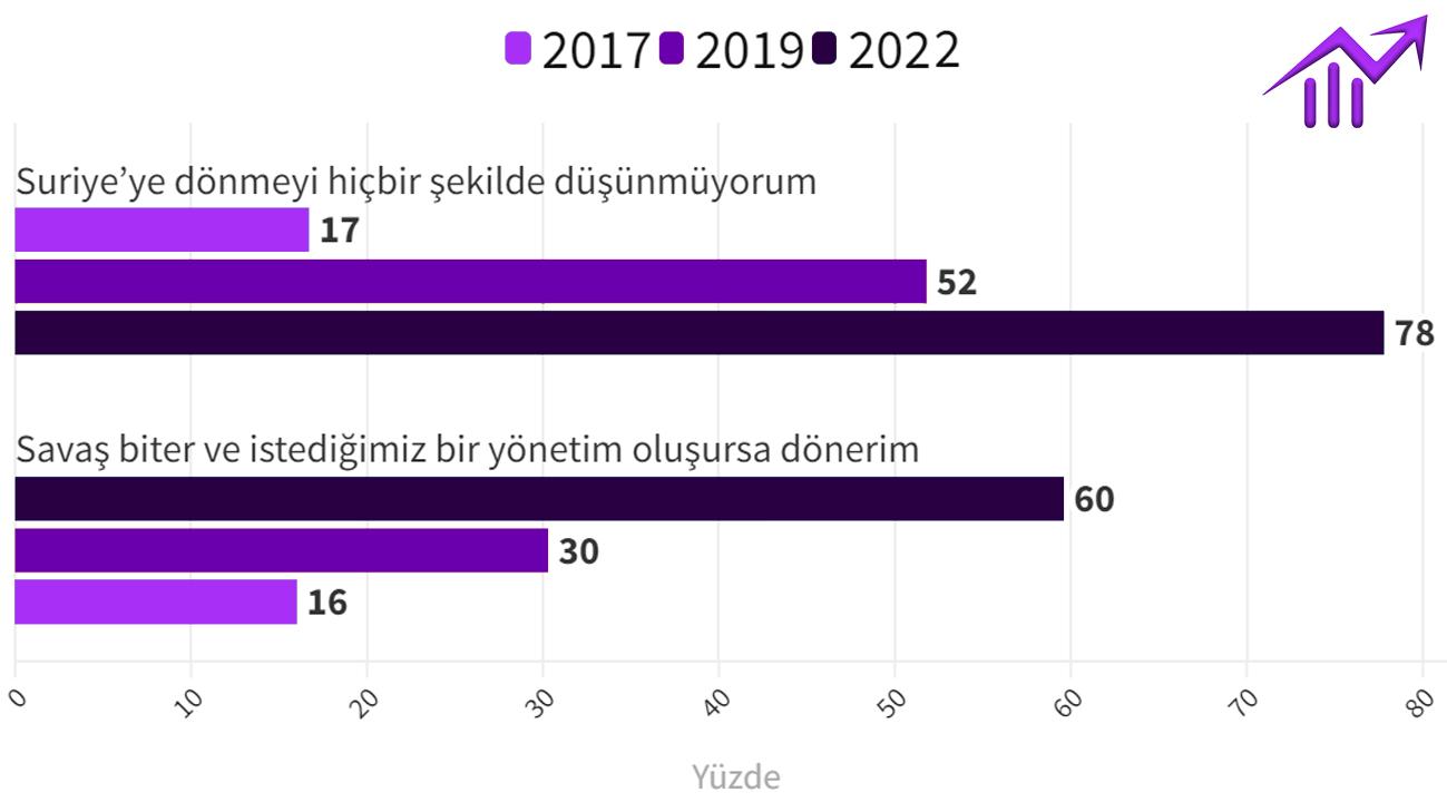 Göç İdaresi Başkanlığı’nın 13 Temmuz 2023 tarihinde yayınladığı son verilere göre 3 milyon 329 bin 516 kayıt altına alınmış geçici koruma statüsündeki Suriyeli mülteci ülke sınırları içerisinde bulunmaktadır. 2023 yılının başından bu güne kadar 8 aylık bir dönem içerisinde kayıtlı Suriyeli sayısı 184 bin 260 kişi azalmıştır. Suriyelilerin katıldığı bir araştırmaya göre; 2017’de Suriyelilerin %17’si ülkelerine hiç geri dönmeyi düşünmüyor. Bu sayı 2019’da %52 ve 2022 yılında %78’dir. 2017’de Suriyelilerin %16’sı savaş biter ve güvenli bir yönetim oluşursa ülkelerine dönmek istiyor. 2019 yılında %30’u ve 2022 yılında %60’ı gerekli şartlar oluşursa ülkelerine kalıcı olarak dönmek istediklerini ifade ediyor.
