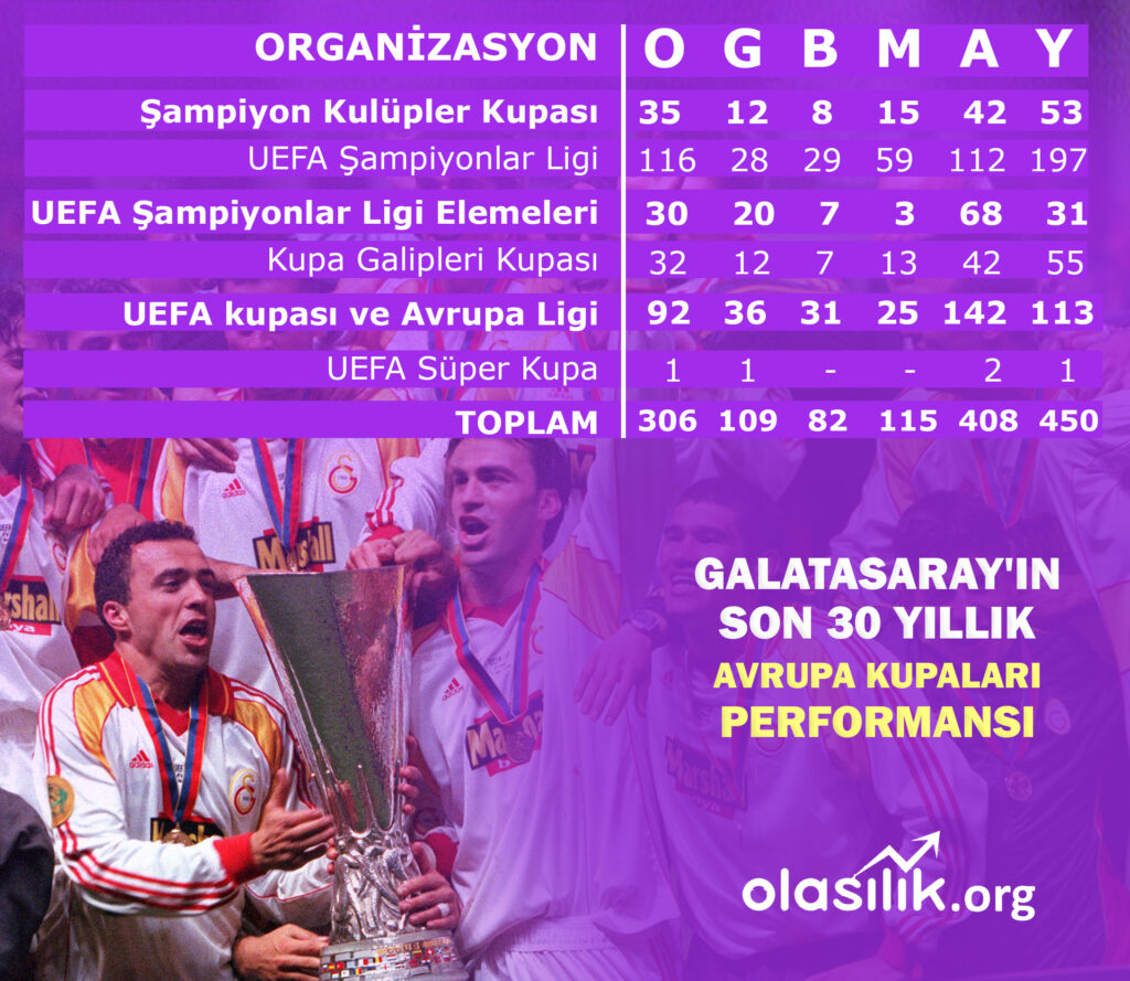 Galatasaray avrupa kupalarında bugüne kadar oynadığı 306 maçın 109’un da galibiyet elde etti. Bu maçların 82’sinde beraberlik alan sarı kırmızılı ekip, 115 maçtada rakiplerine yenildi.
